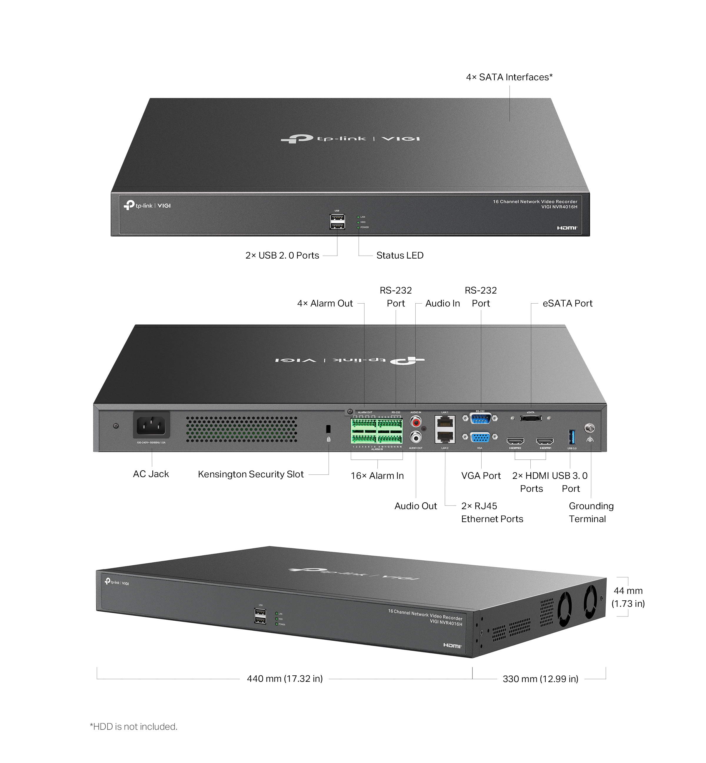 | Package Content | • VIGI Network Video Recorder• Mouse• Installation Guide• Power Cord• HDD Power Cables• HDD Data Cables• Terminal Blocks• Mounting Brackets• Screws• Rubber Feet• HDD Screws |