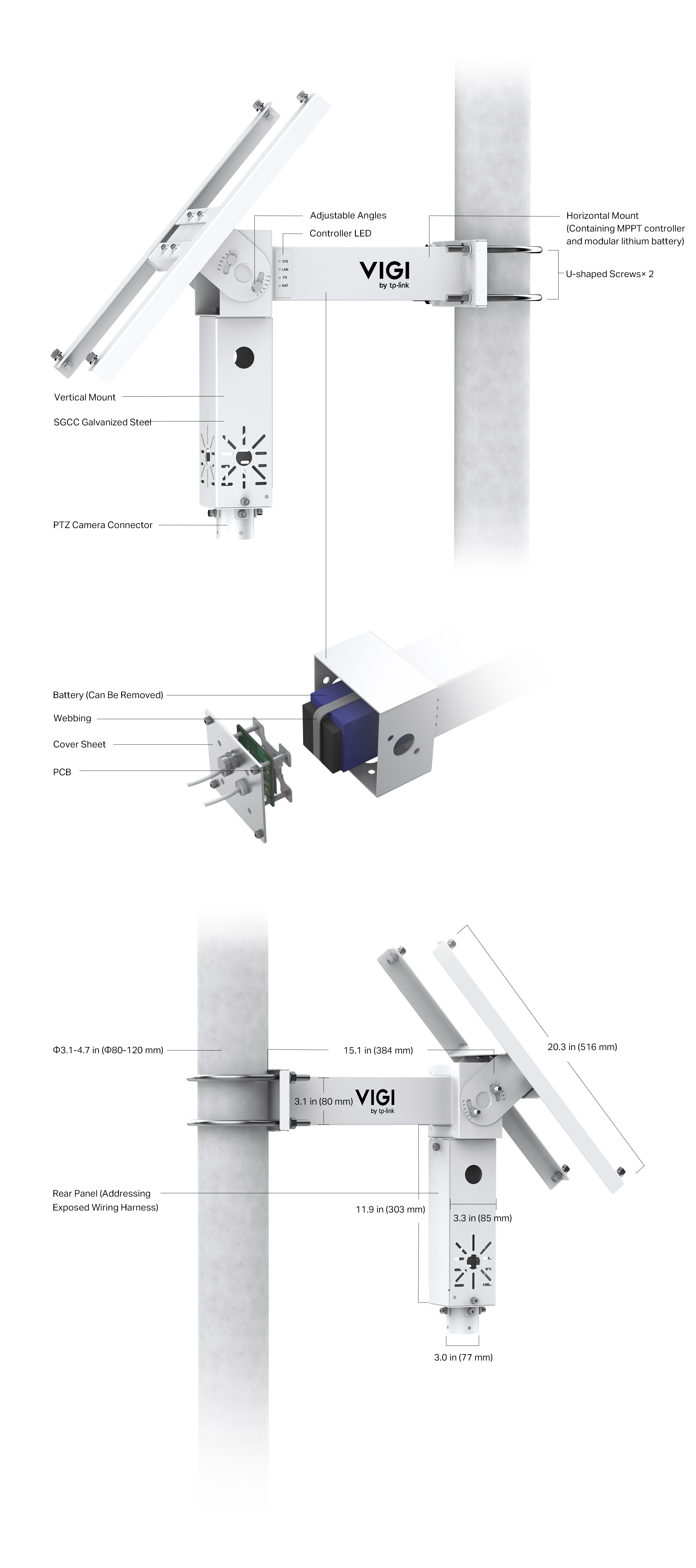 | Compatible Pole Diameter | Ø3.1-4.7 in (Ø80-120 mm) |